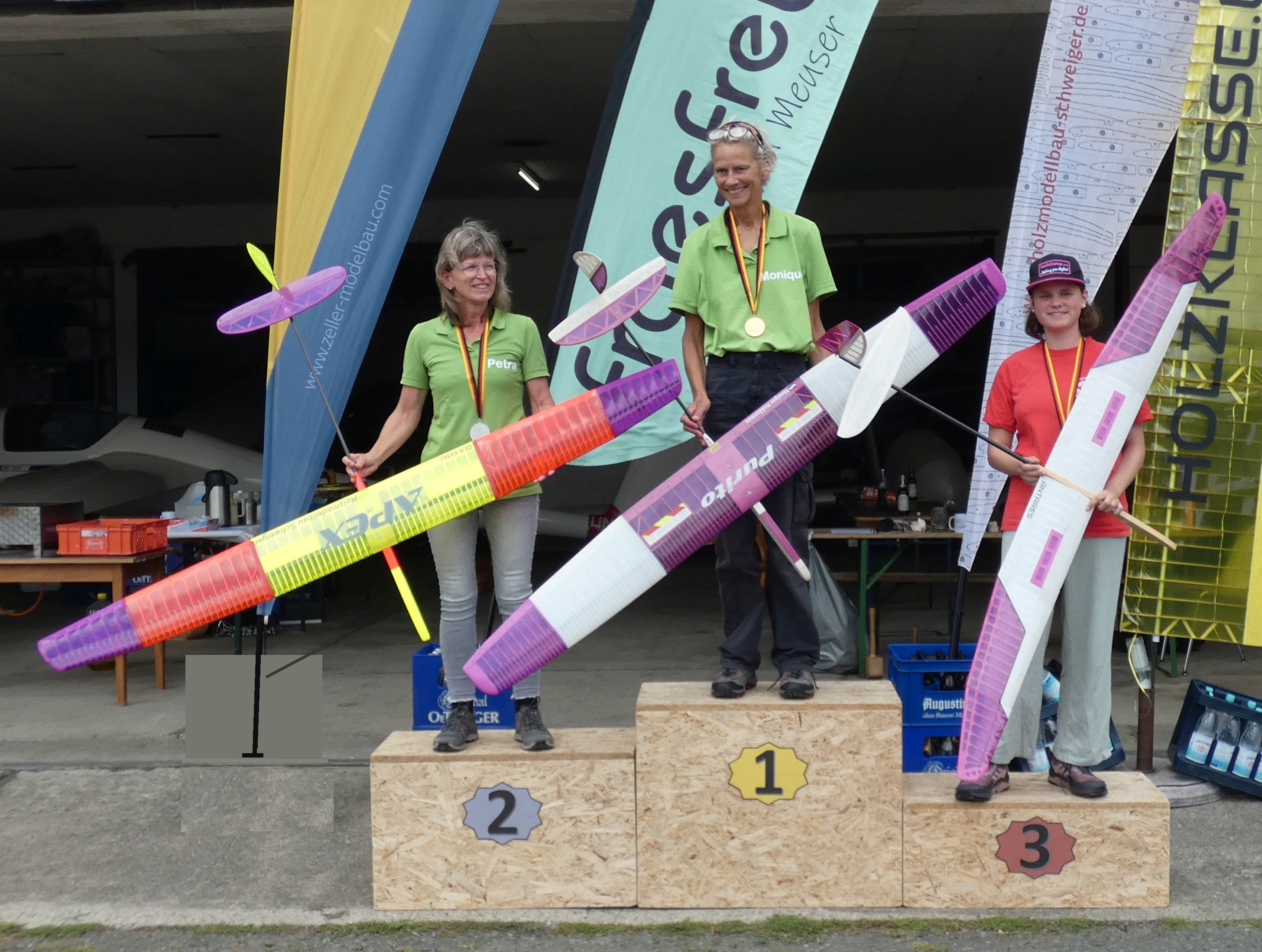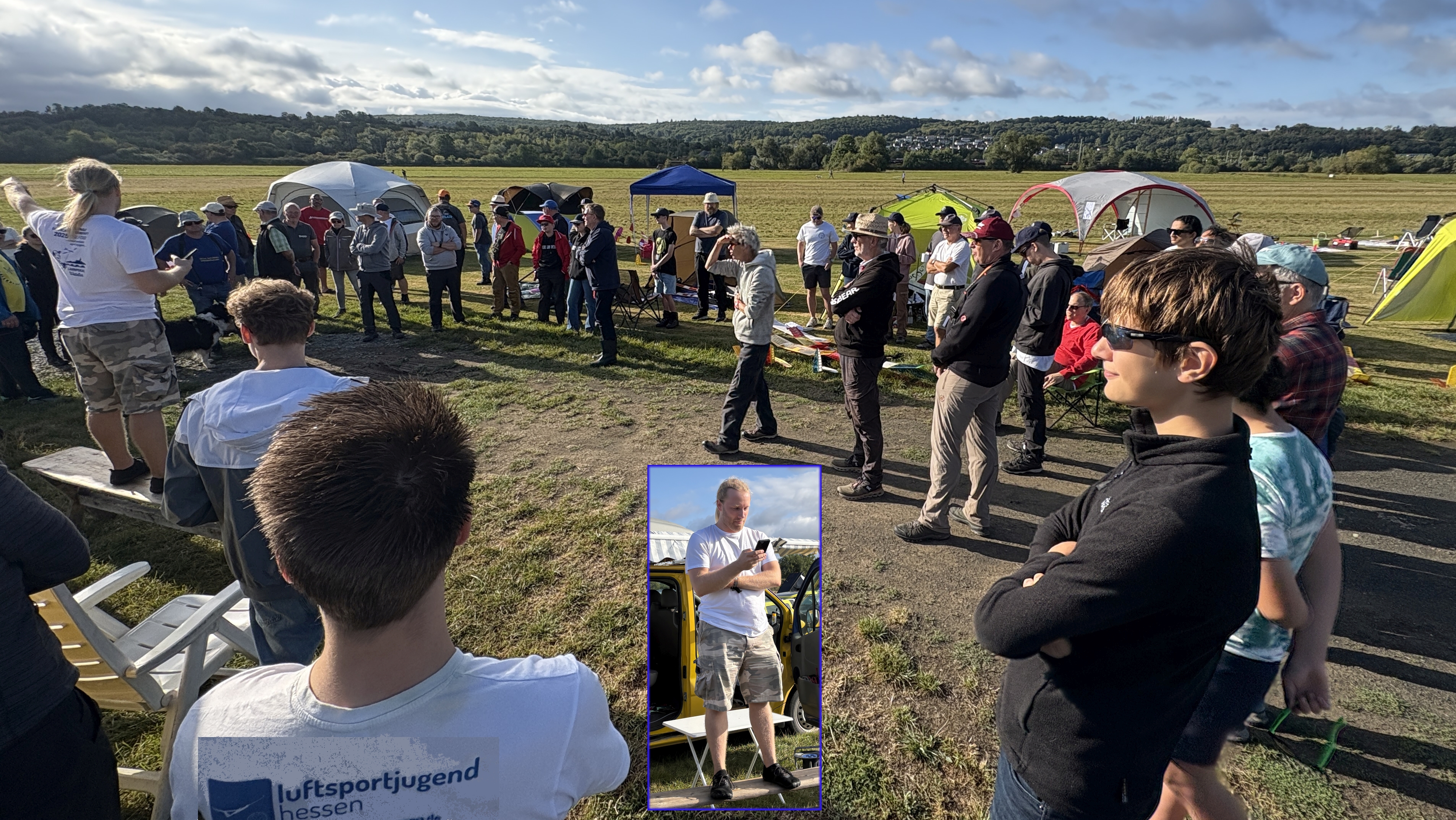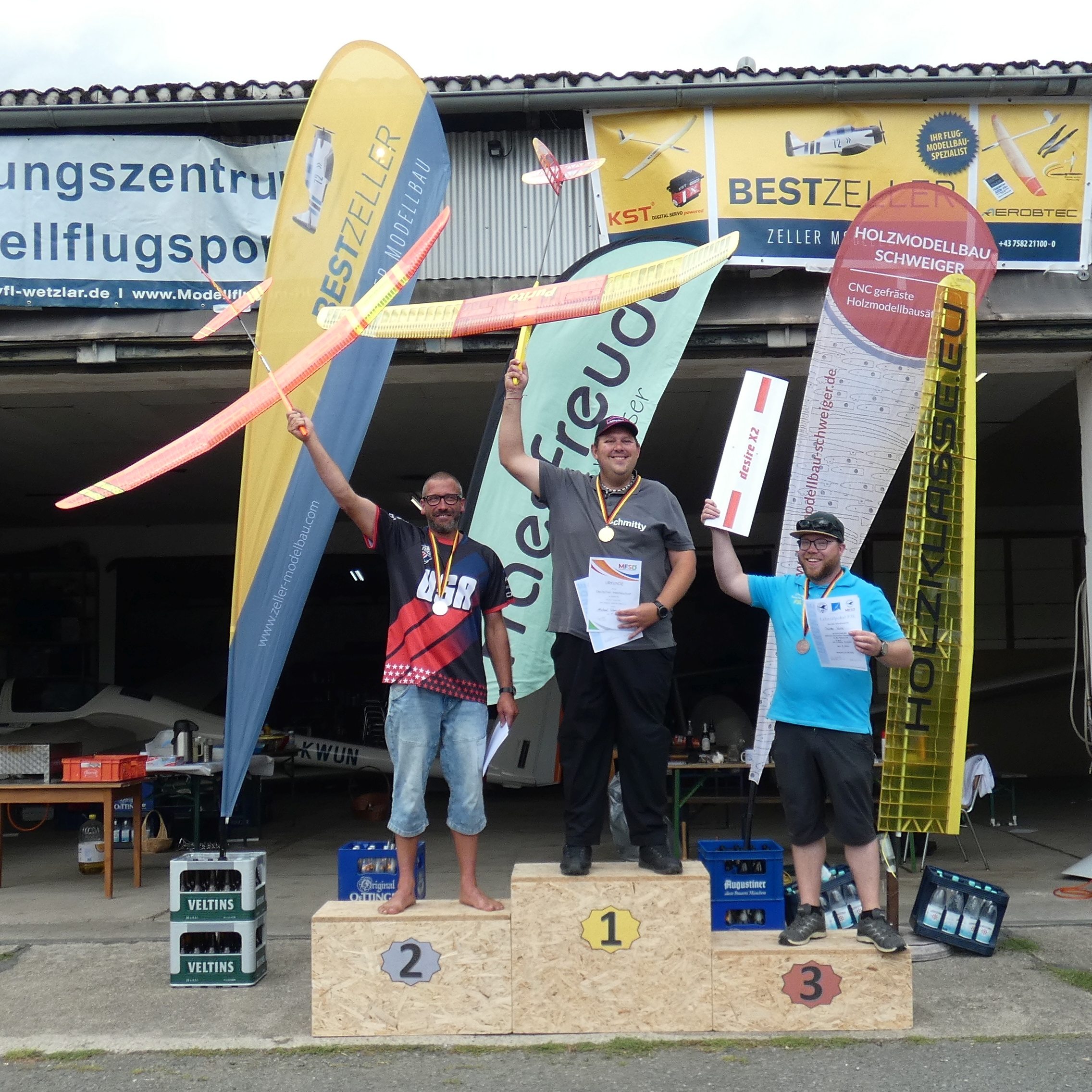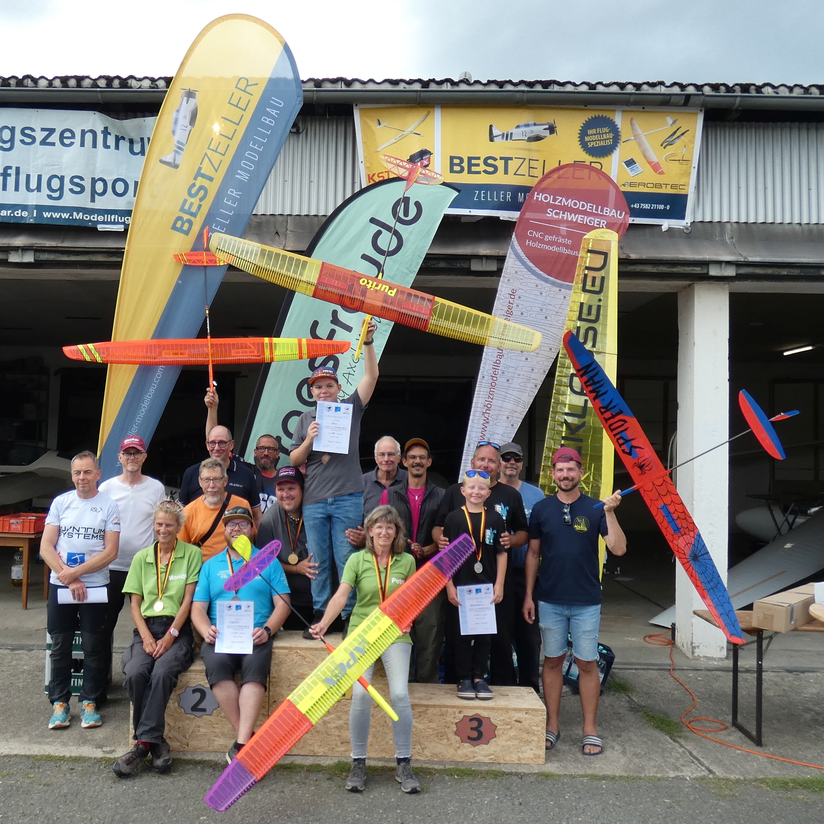 Die Topografie des Lahntals sorgte überraschenderweise bis mittags für einen sachten Rückenwind aus Nord, während die Windkraftanlagen in Sichtweite des Fluggeländes eindeutigen Südwind anzeigten. Diese Windscherung hatte sich nach der Mittagspause glücklicherweise vollständig gelegt, sodass das Fly-Off mit mittlerem Gegenwind geflogen werden konnte. Nach zwei spannenden Fly-Off-Durchgängen konnten wir uns zur Auswertung zurückziehen, während die Piloten entweder anfingen, zusammen zu packen, oder mit den noch liegenden Gummis weiterflogen. Zur Siegerehrung kamen dann alle auf dem Vorplatz des Hangars zusammen.